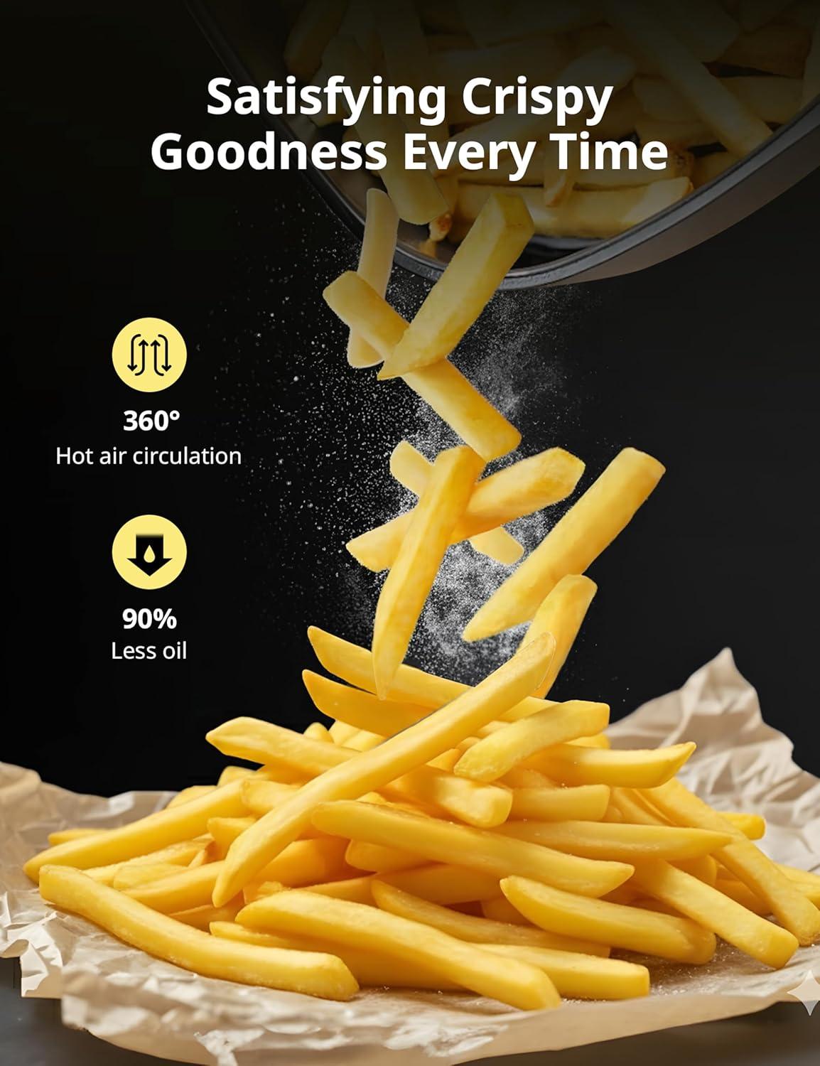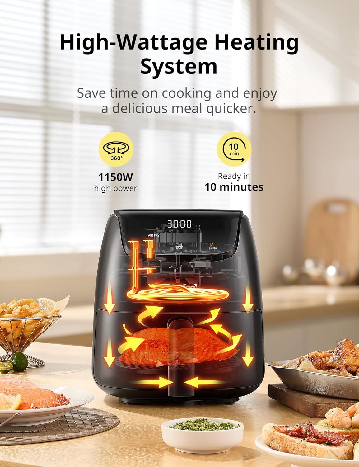 SUPER FAST COOKING, READY IN 10 MINUTES: High-efficiency 1150W heating cooks meals faster than traditional ovens—enjoy crispy fries, wings, and snacks in as little as 10 minutes, with no preheating required.