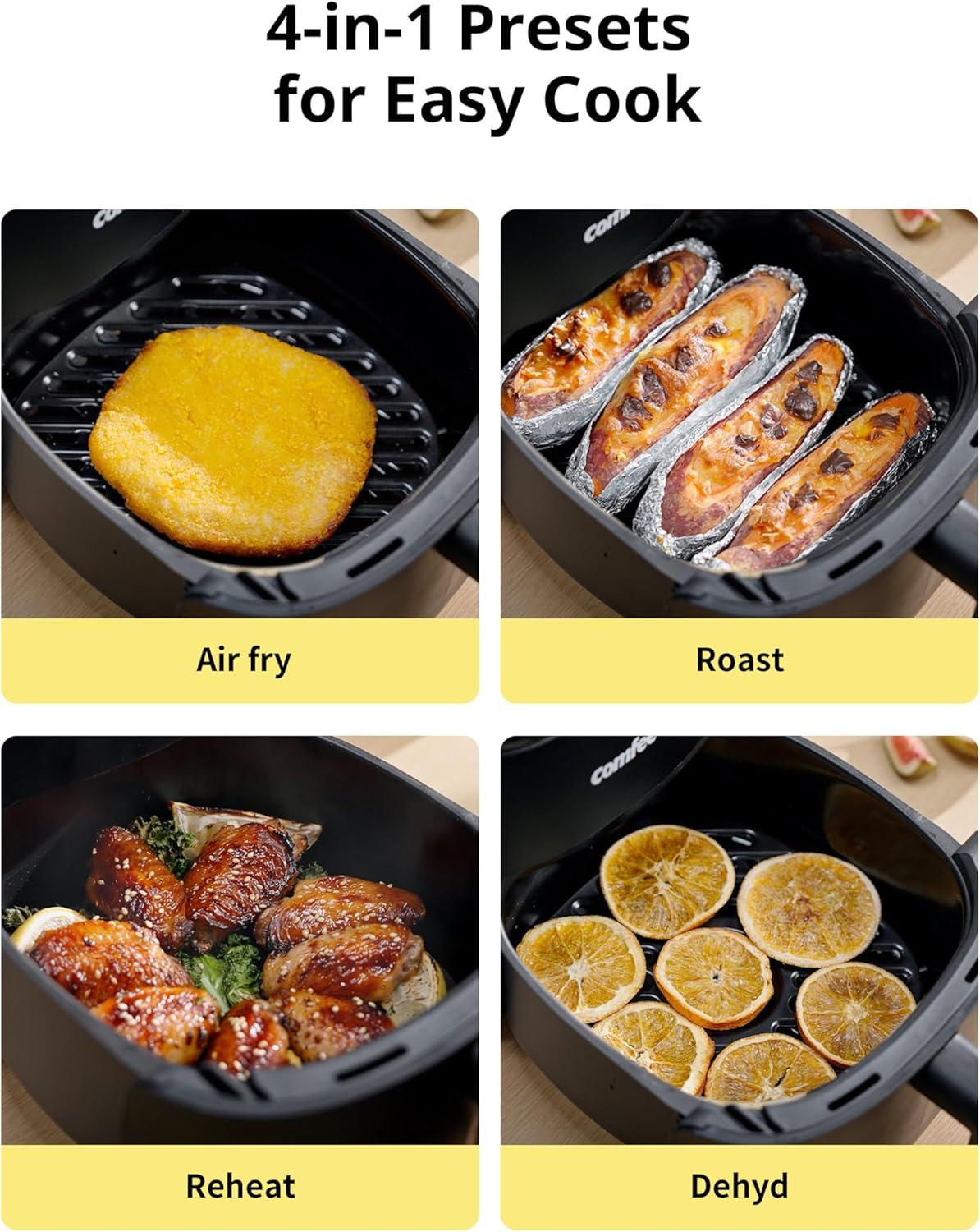 4 SMART PRESETS FOR ONE-TOUCH COOKING: Features four essential presets—Air Fry, Roast, Reheat, Dehydrate—making it easy to cook favorites with a single tap. Perfect for beginners, students, and busy schedules.